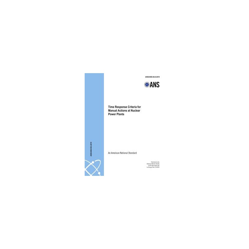 ANS 58.8-2019 establishes criteria and methods for identifying, calculating, validating, tracking, and documenting time requirements for the performance of nuclear power plant time-limited manual actions that are associated with either design-basis events (DBEs) or licensing basis.