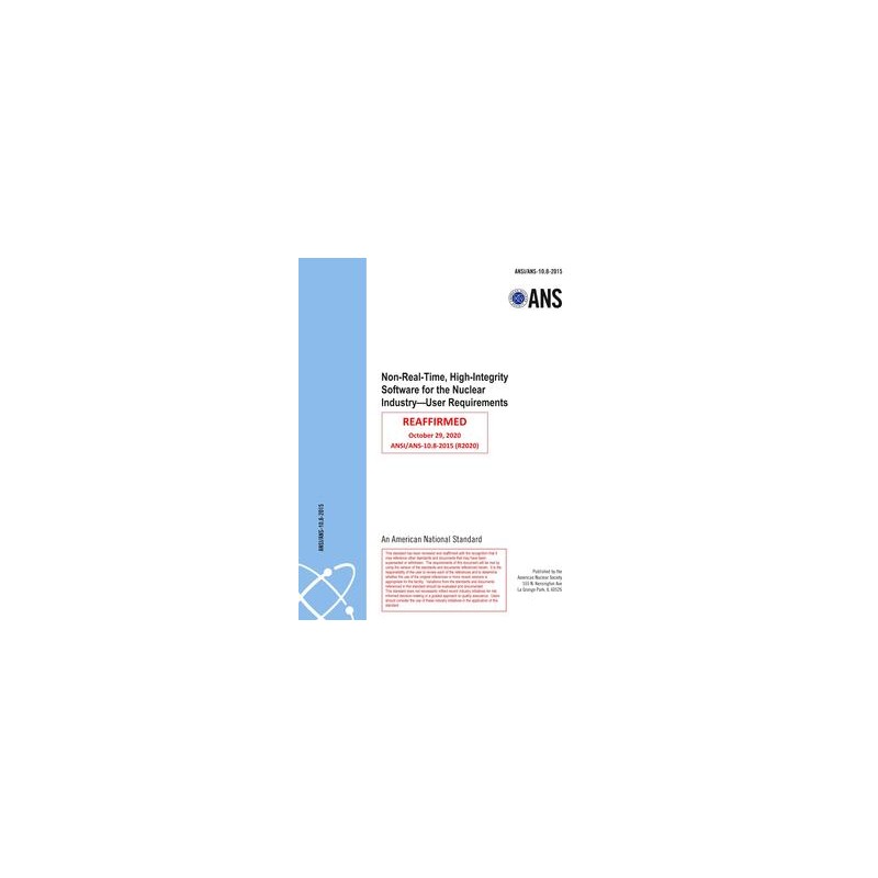 ANS 10.8-2015 (R2020) establishes the minimum requirements for the acceptance and use of non-real-time, high-integrity software used for design and analysis in the nuclear industry. This standard is directly related to ANSI/ANS-10.7-2013 which provides requirements for the developer of non-real-time, high-integrity software. The activities described in this standard enable an end user of complex simulation software to assure, when software has been developed in accordance with appropriate requirements, that the software will meet the specific identified needs of the end user and that the software is installed and used in a correct manner. The type of software discussed in this standard is software used for the analysis, design, and simulation of complex physical systems and phenomena. This type of software requires a high degree of functional reliability in order to reduce the risk of undetected errors.