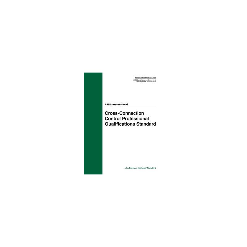 ASSE/IAPMO/ANSI Series 5000-2015 includes professional qualifications standards for the following individuals:5110 - Backflow Prevention Assembly Testers5120 - Cross-Connection Control Surveyors5130 - Backflow Prevention Assembly Repairers5140 - Fire Protection System Cross-Connection Control Testers5150 - Backflow Prevention Program AdministratorsASSE/IAPMO/ANSI Series 5000-2015 establishes minimum performance requirements for testing the following assemblies:1013 - Reduced Pressure Principle Backflow Preventers (RP) and Reduced Pressure Principle Fire Protection Backflow Preventers (RPF)1015 - Double Check Backflow Prevention Assemblies (DC) and Double Check Fire Protection Backflow Prevention Assemblies (DCF)1020 - Pressure Vacuum Breaker Assemblies (PVB)1047 - Reduced Pressure Detector Fire Protection Backflow Prevention Assemblies (RPDF)1048 - Double Check Detector Fire Protection Backflow Prevention Assemblies (DCDF)1056 - Spill Resistant Vacuum Breakers (SRVB)1063 - Air Valve and Vent Inflow PreventersASSE/IAPMO/ANSI Series 5000-2015 containers the following appendices:Appendix A - Troubleshooting Flowcharts for ASSE Test Procedures and One-Hose Test Procedure FlowchartsAppendix B - Schematics for Backflow Assemblies and Backflow Test KitsAppendix C - Field Test Report FormsAppendix D - Troubleshooting GuidesAppendix E - ASSE Field Test Procedures Using Three- and Five- Valve Test KitsAppendix F - One-Hose Field Test ProceduresAppendix G - Vocabulary and Definitions