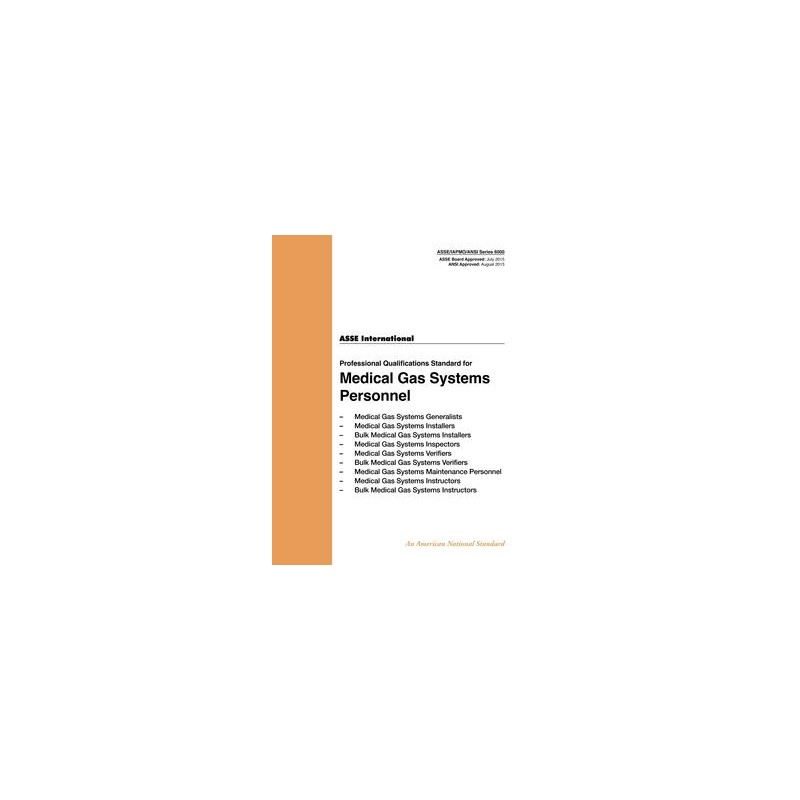 ASSE/IAPMO/ANSI Series 6000-2015 addresses minimum requirements for medical gas, bulk medical gas and vacuum systems installers, inspectors, verifiers, maintenance personnel and instructors.