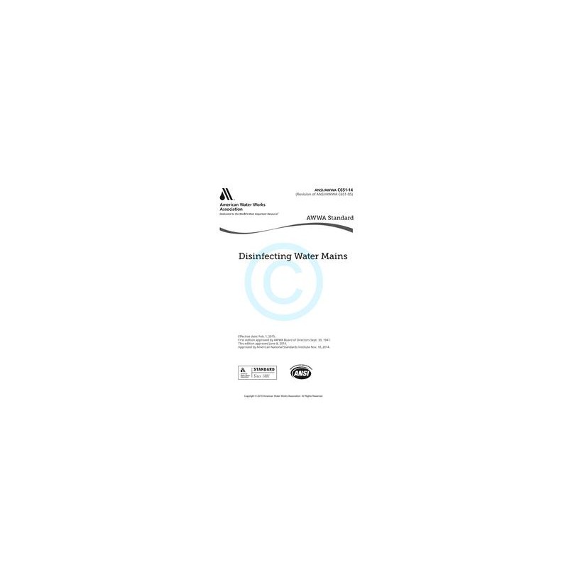 This standard describes essential procedures for the disinfection of new and repaired potable water mains. New water mains shall be disinfected before they are placed in service. Water mains taken out of service for inspection, repair, or other activities may or may not require disinfection and sampling, depending on the risk of contamination. This standard describes the process for evaluating the risk under different conditions.