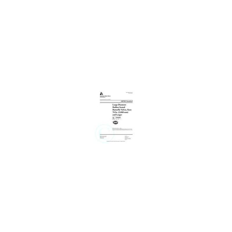This standard describes minimum requirements for rubber-seated butterfly valve assemblies 78 in. (2,000mm) diameter and larger with flanged ends, used in potable water service. It may be referenced in specifications for materials, design, fabrication, coatings, testing, marking, and delivery. The standard includes information (not part of the standard) on unloading, storage, inspection, installation, field testing, operation, and maintenance.