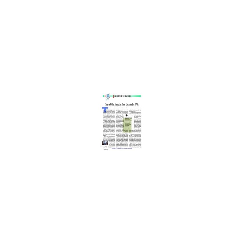 The Safe Drinking Water Act (SDWA) amendments of 1996 contain several important provisions intended to better protect source water from contamination. Three new programs are created, and the existing programs administered by the US Environmental Protection Agency (USEPA) related to source water protection are reauthorized. The amended SDWA provisions are summarized.