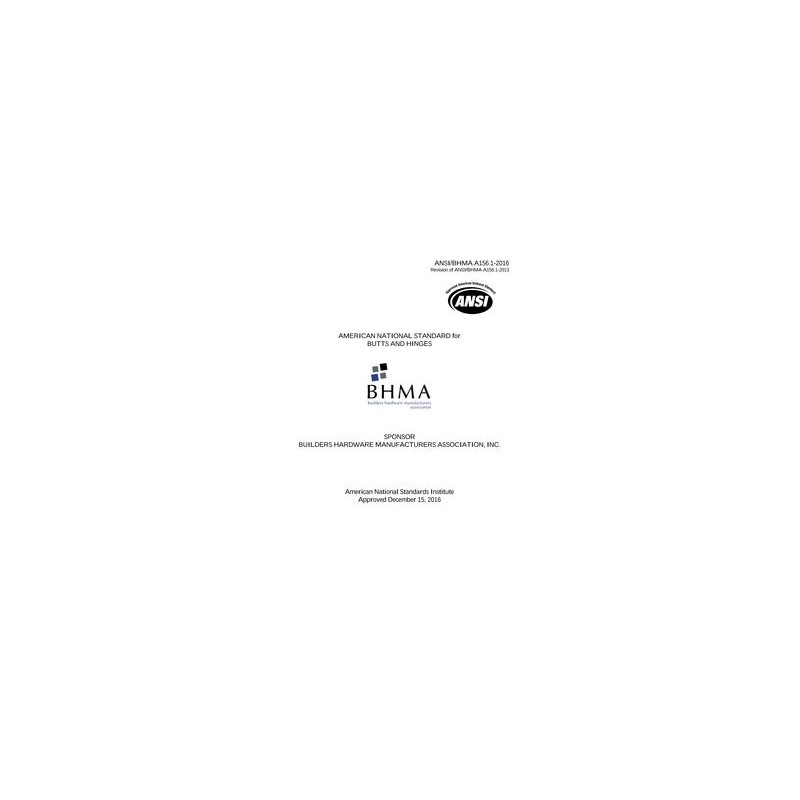 Published: 12/15/2016 ANSI: ANSI Approved Number of Pages: 30 File Size: 1 file , 1.7 MB Part of: BHMA A156 Standards Set, BHMA HANG THE DOOR