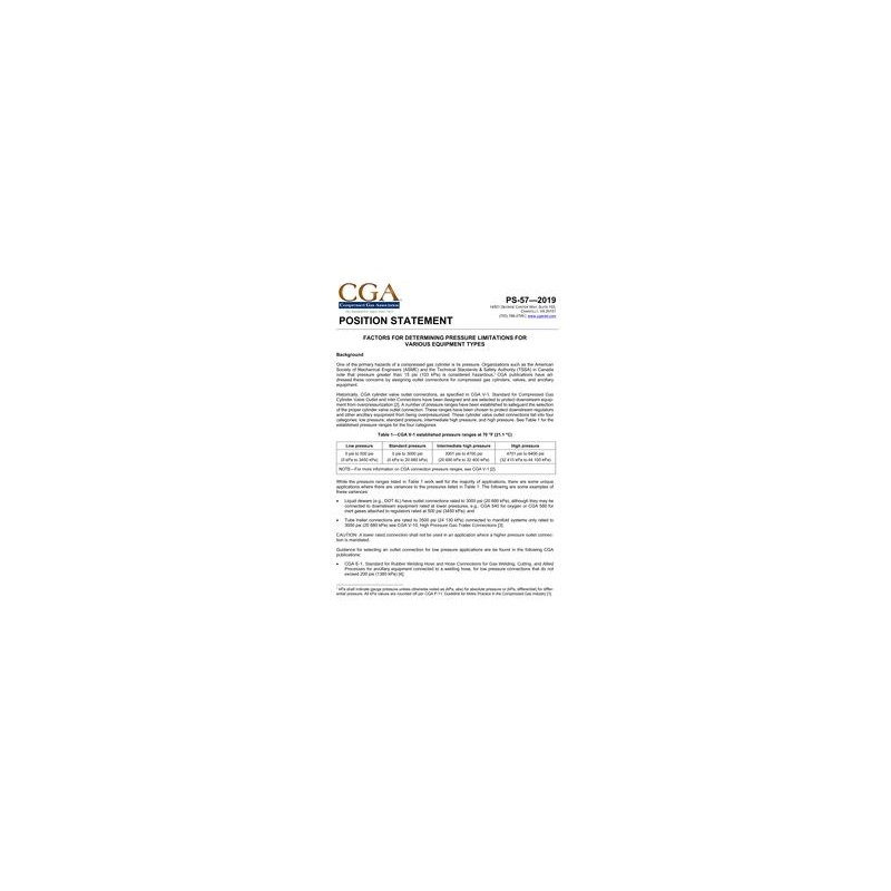 CGA PS-57 addresses the factors that should be considered when determining the required pressure limitation for industrial equipment that will be attached to a CGA outlet connection.