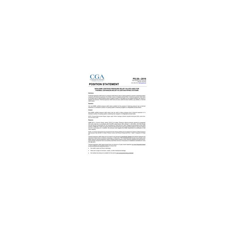CGA PS-28 CGA Position Statement on Non-ASME Certified Pressure Relief Valves Used for Thermal Expansion Relief in Certain Piping Systems, Second Edition