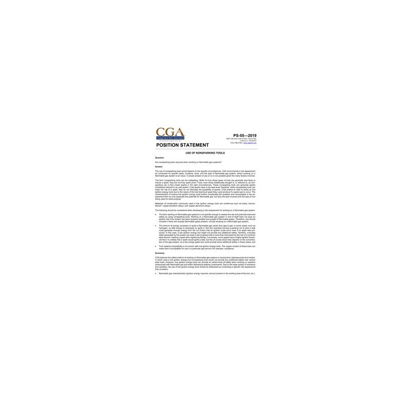 Describes CGA's position on when to use nonsparking tools, better termed as low ignition energy tools, and what should be considered when developing a risk assessment for working on a flammable gas system.