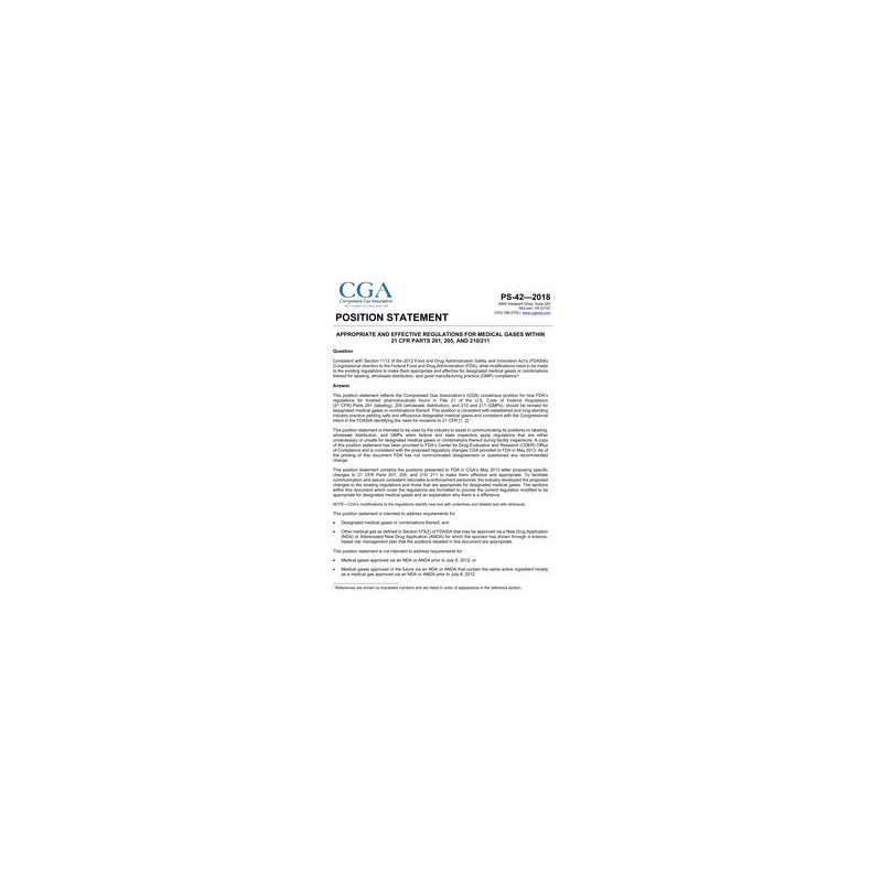 CGA PS-42 CGA Position Statement on Appropriate and Effective Regulations for Medical Gases within 21 CFR Parts 201, 205, and 210/211