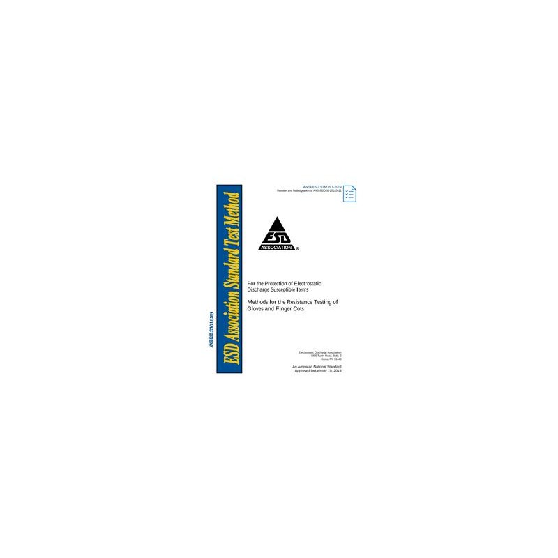 ANSI/ESD STM15.1-2019 provides test procedures for measuring the intrinsic electrical resistance of gloves and finger cots, as well as their electrical resistance, together with personnel as a system. The system test provides data that are relevant to the user?s specific environment and application.