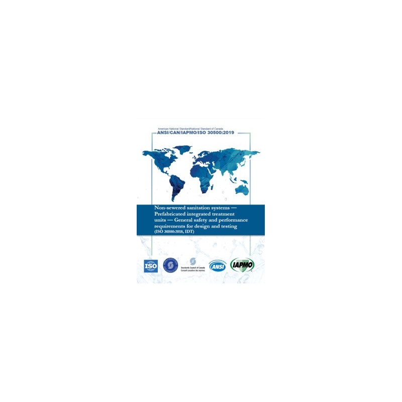ANSI/CAN/IAPMO/ISO 30500 specifies general safety and performance requirements for design and testing as well as sustainability considerations for non-sewered sanitation systems (NSSS). A NSSS, for the purposes of this document, is a prefabricated integrated treatment unit, comprising frontend (toilet facility) and backend (treatment facility) components that a) collects, conveys, and fully treats the specific input within the system, to allow for safe reuse or disposal of the generated solid, liquid, and gaseous output, and b) is not connected to a networked sewer or networked drainage systems.This document is applicable to sanitation systems that are either manufactured as one package, or manufactured as a set of prefabricated elements designed to be assembled in one location without further fabrication or modification that influences the system function. The plane or surface (e.g. flooring, concrete pad) upon which a fully assembled NSSS is situated is beyond the scope of this document. This document is not applicable to sanitation systems constructed in situ.