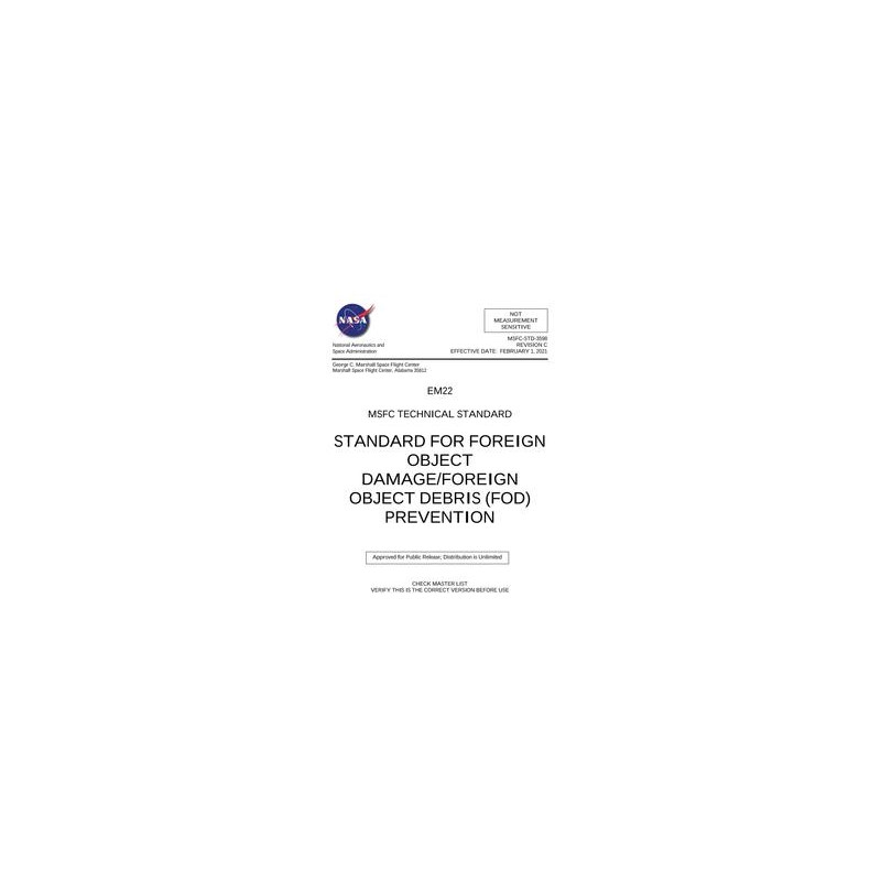 This standard establishes general practices and standard terms for the prevention of Foreign Object Damage (FOD) to Marshall Space Flight Center (MSFC) products, which include flight hardware and associated test hardware, facilities, Ground Support Equipment (GSE), and related components for MSFC-managed projects/programs.