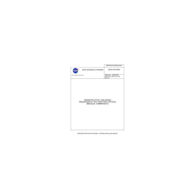 The purpose of this NASA Technical Standard is to establish the nondestructive evaluation (NDE) requirements for any NASA system or component, flight or ground, where fracture control is a requirement. This NASA Technical Standard defines the primary requirements for NDE in support of NASA-STD-5019A, Fracture Control Requirements for Spaceflight Hardware. NDE applied in-process for purposes of process control and NDE of damage tolerant composites are not addressed in this document.