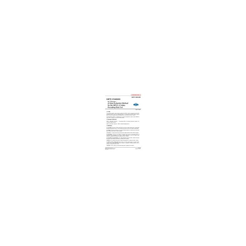 This standard specifies a data reduction method for the MPEG-2 video recoding data set for SDTV as defined in SMPTE 327M. The coding information is as derived from an ISO/IEC 13818 compliant MPEG bit stream during the picture decoding process, as described in ISO/IEC 13818-2. This data-reduced MPEG-2 recoding data set may be transported by various means defined in other SMPTE standards (see annex for further details).