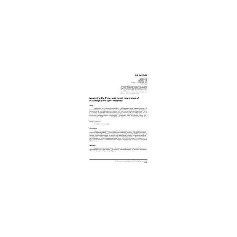 The purpose of TAPPI TIP 0420-09 is to define a standard method for the determination of the indentation of elastomeric roll cover materials by means of a Pusey and Jones type plastometer. This apparatus is used to measure the depth of indentation of an indentor, under fixed force, into the surface of the material. ASTM D 531 Standard Test Method for Rubber Property-Pusey and Jones Indentation is the basis for this method, but it has been broadened to include elastomeric materials other than rubber, such as polyurethane, and it has been broadened to cover the in-situ measurement of cover materials. The method is limited to elastomeric materials with a measurement of 0 to 300 P