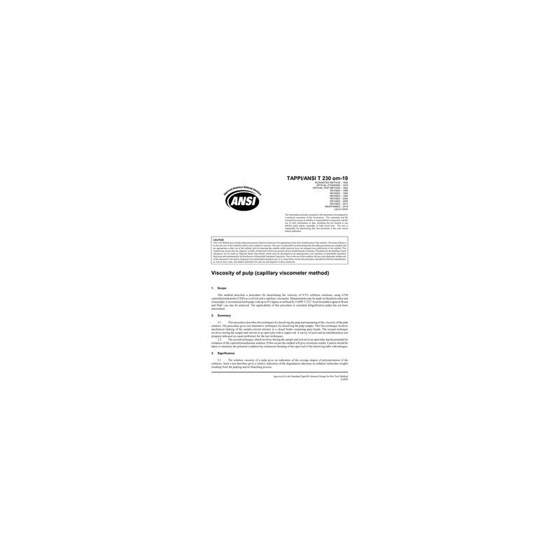 This method describes a procedure for determining the viscosity of 0.5% cellulose solutions, using 0.5M cupriethylenediamine (CED) as a solvent and a capillary viscometer. Measurements may be made on bleached cotton and wood pulps. Conventional kraft pulps with up to 4% lignin, as defined by TAPPI T222 "Acid-Insoluble Lignin in Wood and Pulp" can also be analyzed. The applicability of this procedure to extended delignification pulps has not been determined.