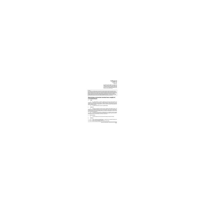 TAPPI T 844 pm-15 describes a procedure to determine the nominal basis weight (grade) of the componentsof corrugated board. It is based on TIP 0308-01, now withdrawn. Test specimens of corrugated fiberboard aretreated with water so that the component layers can be separated, dried, and weighed. The goal of the method is not to determine the exact basis weights of the papers comprising a corrugated specimen, but rather to identify the probable marketing grade under which the papers were likely sold.