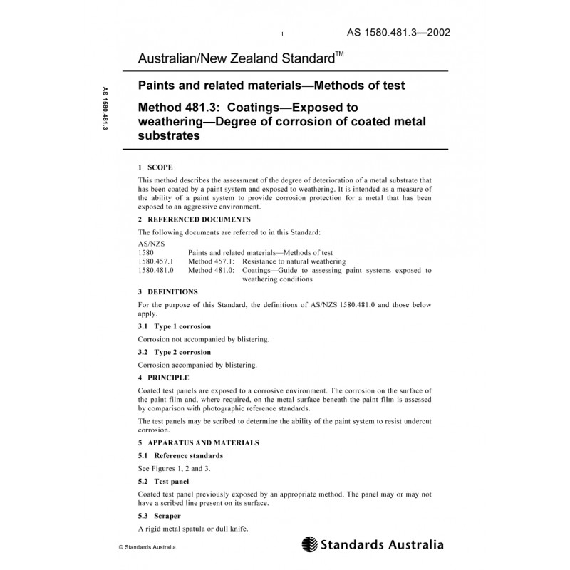AS 1580.481.3-2002 Paints and related materials - Methods of test, Method 481.3: Coatings - Exposed to weathering - Degree of corrosion of coated metal substrates
