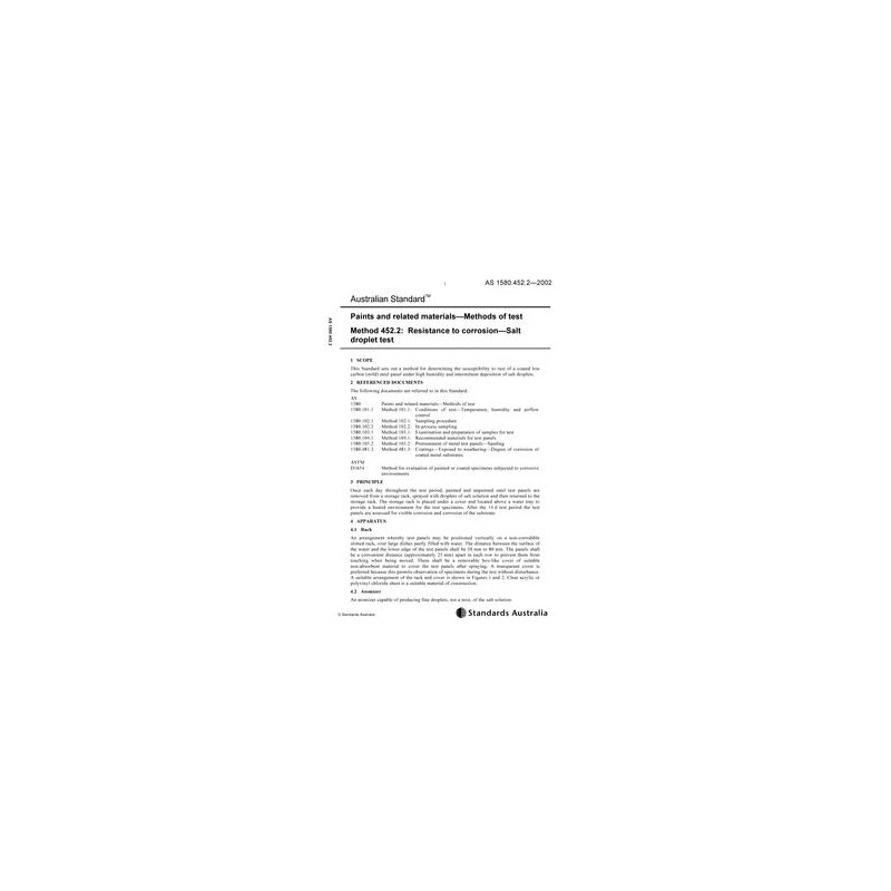 AS 1580.452.2-2002 [ Current ] Paints and related materials - Methods of test, Method 452.2: Resistance to corrosion - Salt droplet test