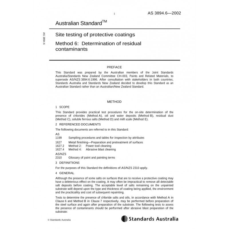 AS 3894.6-2002 [ Current ] Site testing of protective coatings, Method 6: Determination of residual contaminants