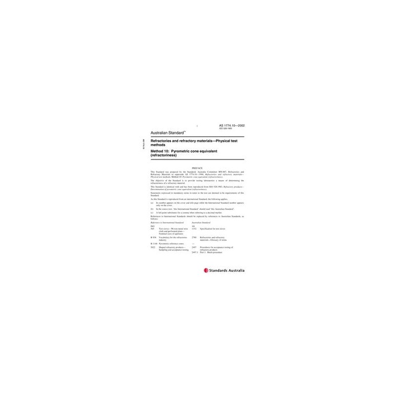 AS 1774.10-2002 [ Current ] Refractories and refractory materials - Physical test methods, Method 10: Pyrometric cone equivalent (refractoriness)