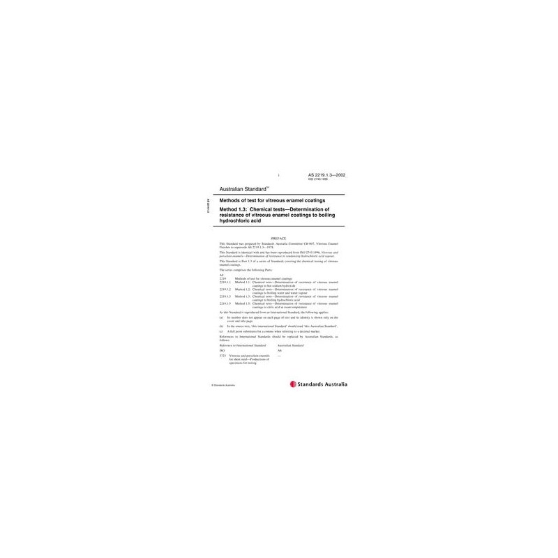 AS 2219.1.3-2002 Methods of test for vitreous enamel coatings - Chemical tests - Determination of resistance of vitreous enamel coatings to boiling hydrochloric acid