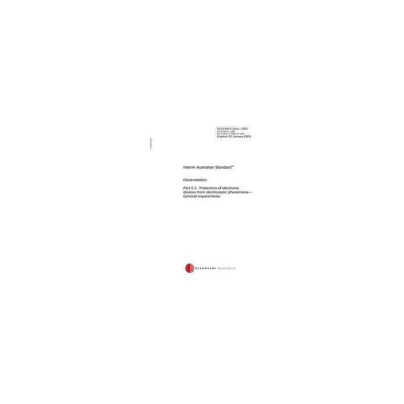 Specifies the general requirements for the protection of electrostatic discharge devices (ESDs) from electrostatic discharges and fields. Also specifies methods for the design, use and control of a protected area to ensure that ESDs, having a withstand threshold voltage of 100 V (human body model) or higher, can be handled with a minimum risk of damage resulting from electrostatic phenomena. This Interim Australian Standard is identical in technical content to and reproduced from IEC 61340-5-1:1998 and its Corrigendum 1999-02.