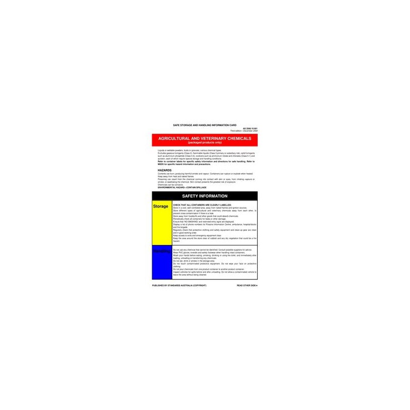 Provides general safety information for storing and handling agricultural and veterinary chemicals, including first aid information and emergency procedures for dealing with leaks, spills and fires. An outline of the classes of dangerous goods and poisons schedules is also given.