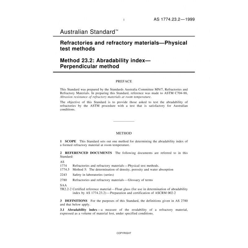 AS 1774.23.2-1999 [ Current ] Refractories and refractory materials - Physical test methods, Method 23.2: Abradability index - Perpendicular method