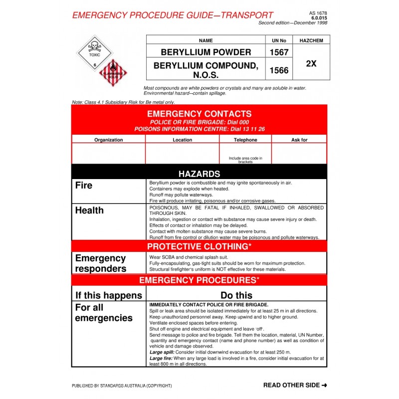 AS 1678.6.0.015-1998 [ Superseded ] Emergency procedure guide - Transport - Beryllium powder, beryllium compound N.O.S.