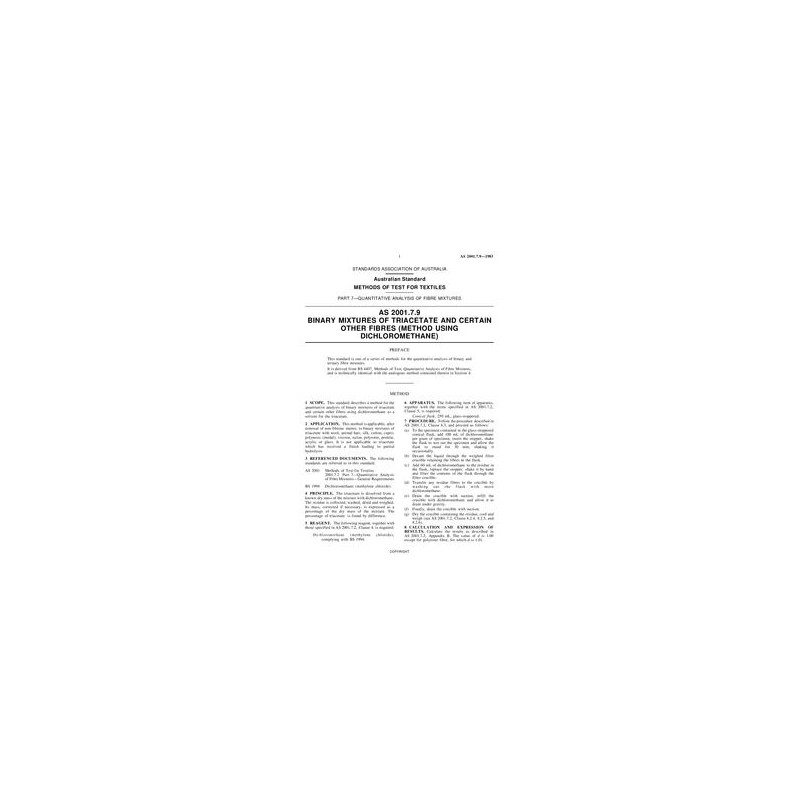 AS 2001.7.9-1983 Methods of test for textiles - Quantitative analysis of fibre mixtures - Binary mixtures of triacetate and certain other fibres (method using dichloromethane)