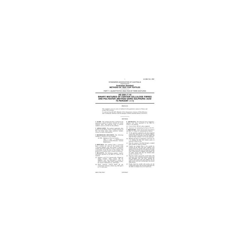 AS 2001.7.10-1983 Methods of test for textiles - Quantitative analysis of fibre mixtures - Binary mixtures of certain cellulose fibres and polyester (method using sulphuric acid 75% m/m)