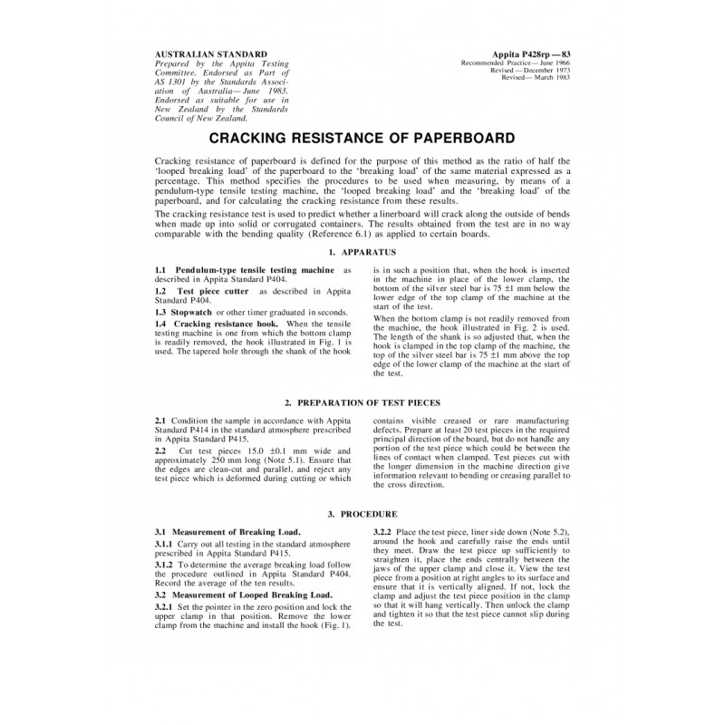 AS 1301.P428RP-1983 [ Withdrawn ] Methods of test for pulp and paper (metric units) - Cracking resistance of paperboard