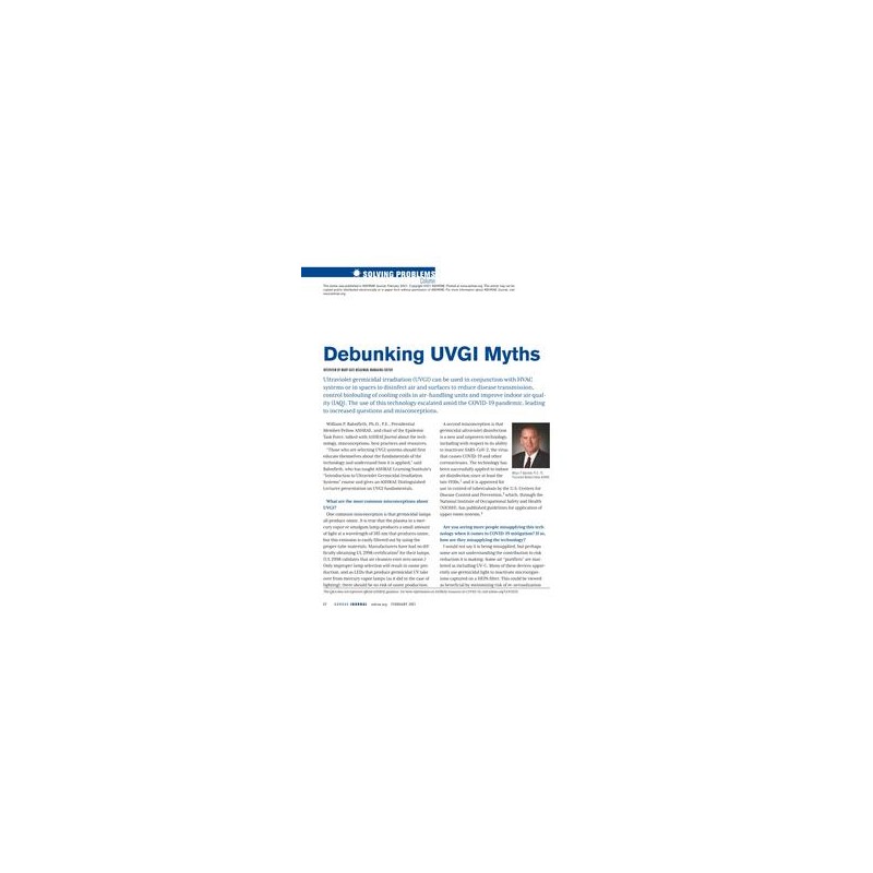 Using ultraviolet germicidalirradiation to disinfect air and surfaces escalated amid the COVID-19 pandemic,leading to increased questions and misconceptions. William P. Bahnfleth, Ph.D.,P.E., Presidential Member/Fellow ASHRAE, and chair of the Epidemic Task Force,talked with ASHRAE Journal about the technology, misconceptions, best practicesand resources.