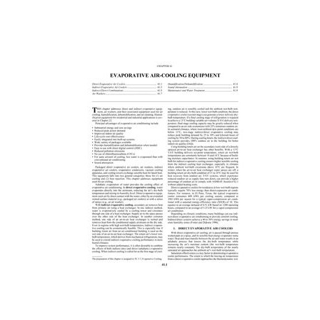 This chapter addresses direct and indirect evaporative equipment, air washers, and their associated equipment used for air cooling, humidification, dehumidification, and air cleaning. Humidification equipment for residential and industrial applications is covered in Chapter 22.