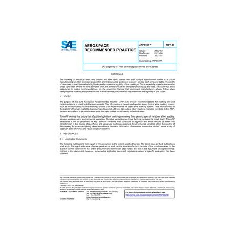 The purpose of this SAE Aerospace Recommended Practice (ARP) is to provide recommendations for marking wire and cable insulations to meet legibility requirements. This information is generic and applies to any type of wire marking system, such as an ultraviolet (UV) laser marking system or an inkjet or other ink based wire marking system. This ARP is limited to the legibility of human-readable characters and does not address bar code or other machine-readable symbols. In this ARP, the term wire refers to jacketed cables and fiber optic cables in addition to individual wires. This ARP defines the factors that affect the legibility of markings on wiring. Two generic types of variables affect legibility: stimulus variables and environmental variables. Stimulus variables are those factors involving the mark itself. This ARP establishes a set of guidelines for key stimulus variables that contribute to legibility and which should be taken into consideration in the course of specifying and using wire marking equipment. Environmental variables affect the reading of the marking, for example lighting, observer-stimulus distance, orientation of observer to stimulus, clutter, visual acuity of observer, state of mind, and visual exposure duration.